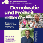 Wie begegnen wir autoritären und faschistischen Tendenzen, die durch Rassismus, völkische Bewegungen und globale Krisen verstärkt werden? Wie lässt sich die Demokratie verteidigen und weiterentwickeln – oder ist sie selbst Teil des Problems? Partizipative Diskussion im Rahmen der Koblenzer Wochen der Demokratie mit Jörg Bergstedt (Umweltaktivist, Publizist), Carl-Bernhard von Heusinger (MdL, Bündnis 90/Die Grünen) und Dir? Herzliche Einladung!