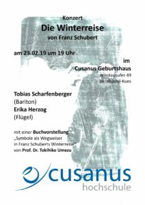 Dazu wird es eine Buchvorstellung durch Prof. Dr. Harald Schwaetzer zu „Symbole als Wegweiser in Franz Schuberts Winterreise“ von Prof. Dr. Tokihiko Umezu geben.